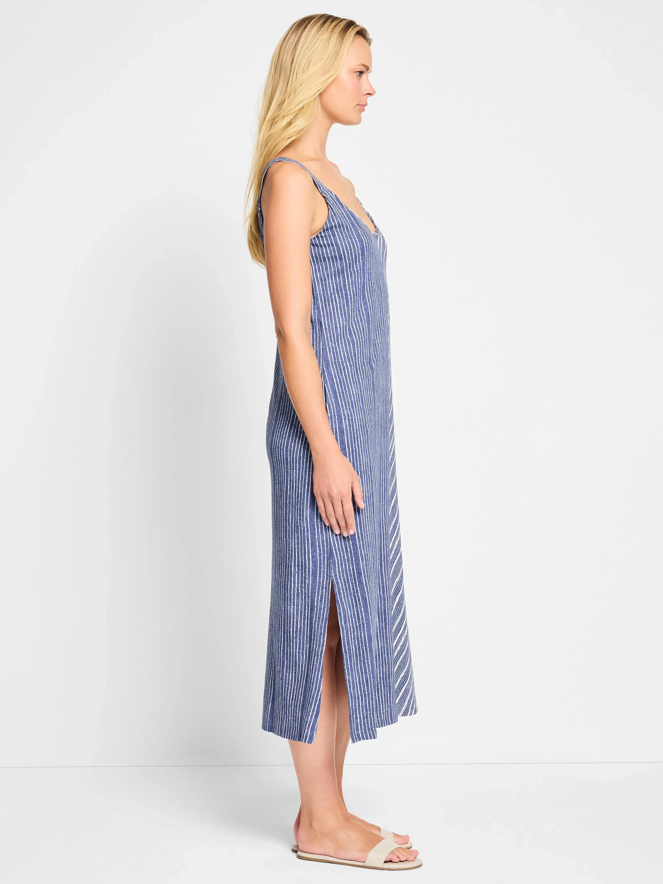 Two types of stripe are better than one. Knit from our breathable cotton modal blend with a touch of drape, this easy V-neck tank dress is simply brilliant: the perfect addition to your warm weather rotation or under a blazer or cardigan. Sleeveless with extra length to the sheath shape that brings the hem down to around the calf. With side seam pockets and slits for more airflow and shape.